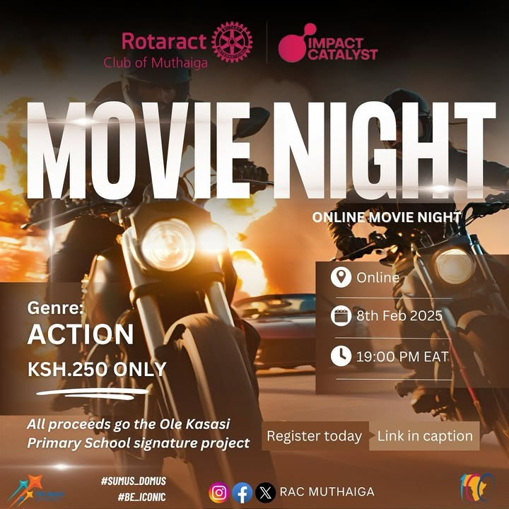 Join us online for an action movie night. All proceeds go to our signature project at Ole Kasasi Primary School.